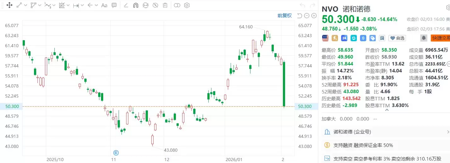 2月4日,丹麦制药巨头诺和诺德在美国上市的股票周二暴跌超过14%,收报50.3美元。此前该公司意外发布预警,称其2026年的销售额将比预期下降得更为严重,原因是价格压力影响了其畅销的糖尿病和减肥药物在美国的销售情况。