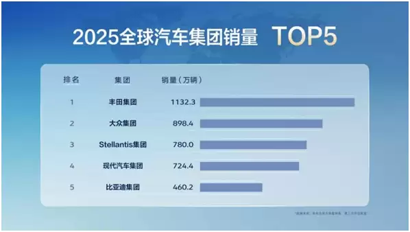 全球汽车产业格局正在经历一场深刻变革,中国车企比亚迪凭借460.2万辆的年度销量,首次跻身全球汽车集团前五,成为首个达成这一里程碑的中国品牌。这一突破不仅超越了通用、福特、本田、日产等传统国际巨头,更标志着中国汽车工业从“市场换技术”向“技术输出全球”的跨越式发展。
