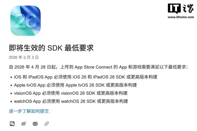 2月4日,IT之家报道称,苹果公司于昨日(2月3日)正式发布一则公告,宣布自2026年4月28日起,将上调提交至App Store的应用程序所使用SDK的最低版本要求。