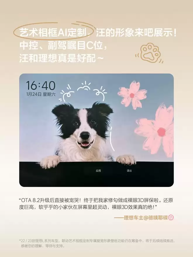 借助车机系统与艺术相框功能的深度联动,用户可以将自家爱宠的照片生成为车机壁纸,甚至让已故宠物的影像以数字化形式长存车内,带来独特的陪伴感。对于配备舱内 RGB 摄像头的 2024 款理想 L 系列及 MEGA 车型,车主更能通过理想汽车App 远程查看车内实时影像。