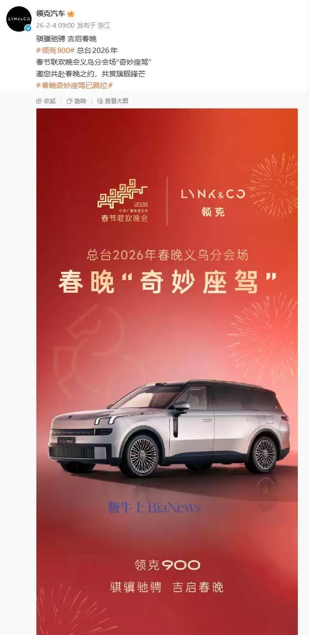 最近,领克汽车通过社交平台公布了一则引人瞩目的消息:领克900正式获选为2026年春节联欢晚会义乌分会场的官方指定用车,并赢得了“奇妙座驾”的美誉。这次合作不仅凸显了领克品牌对高端市场的深入布局,更让其旗舰车型领克900增添了独特的文化魅力。