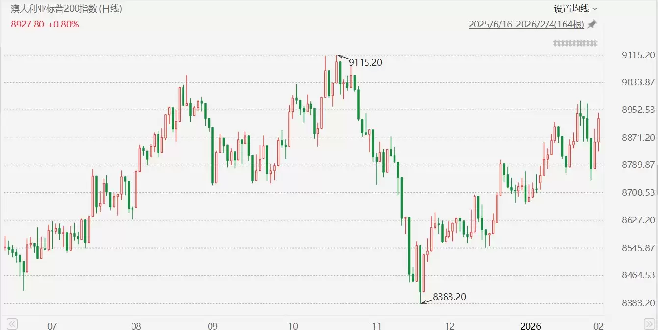 2月4日,澳大利亚基准股指S&P/ASX200以0.80%的涨幅收盘,上涨70.70点,收于8927.80点。
