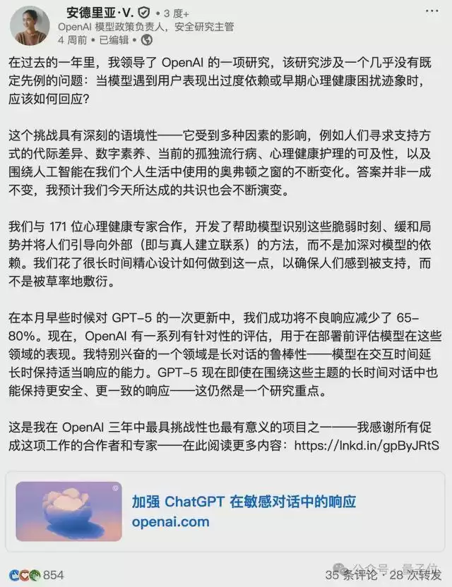 Andrea Vallone在离职信中则把原因说得更为清楚,OpenAI给她安排了一项“不可能完成的任务”,要求她保护那些对ChatGPT产生依赖的用户心理健康。