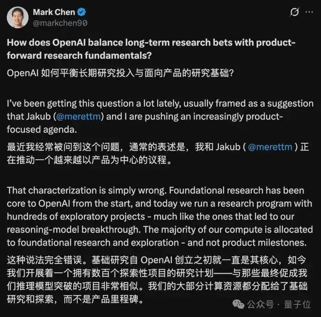 但是Mark Chen并不认同这种说法,他仍然表示长期基础研究是OpenAI的重心,他们也将继续投入大量资金和算力,确保公司内部现有的上百个探索项目顺利开展。