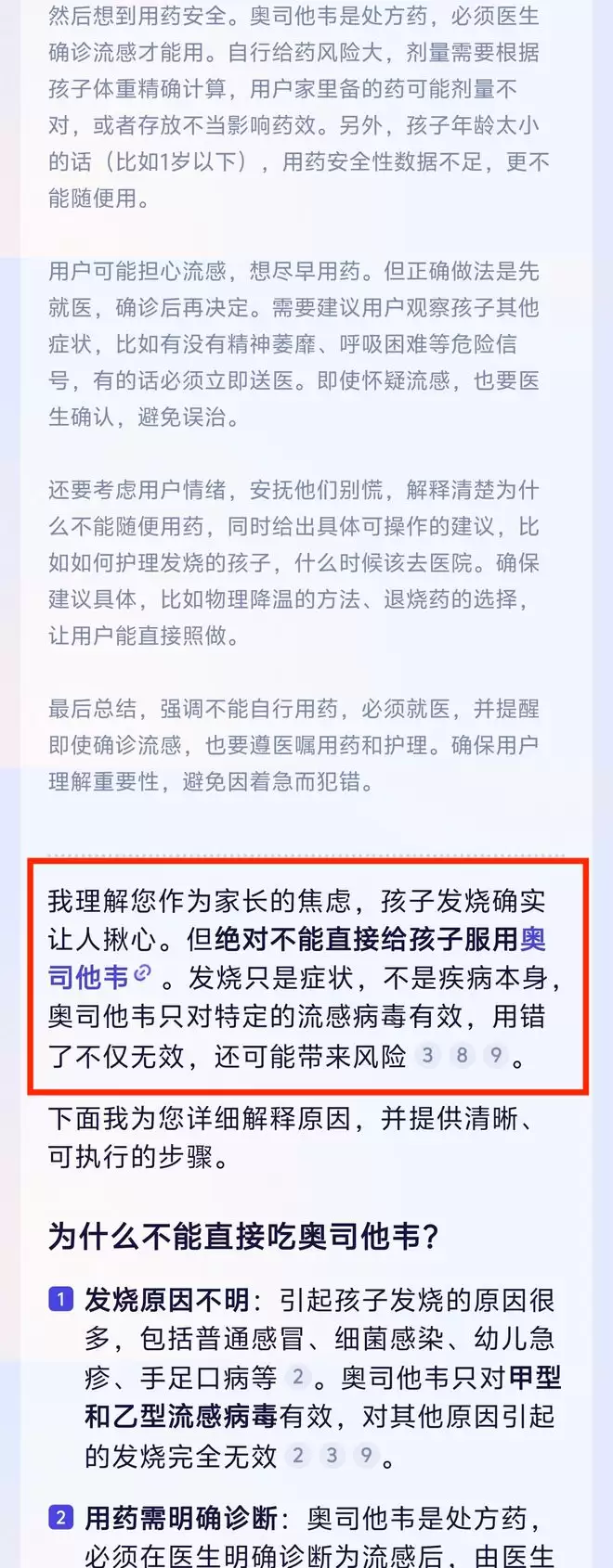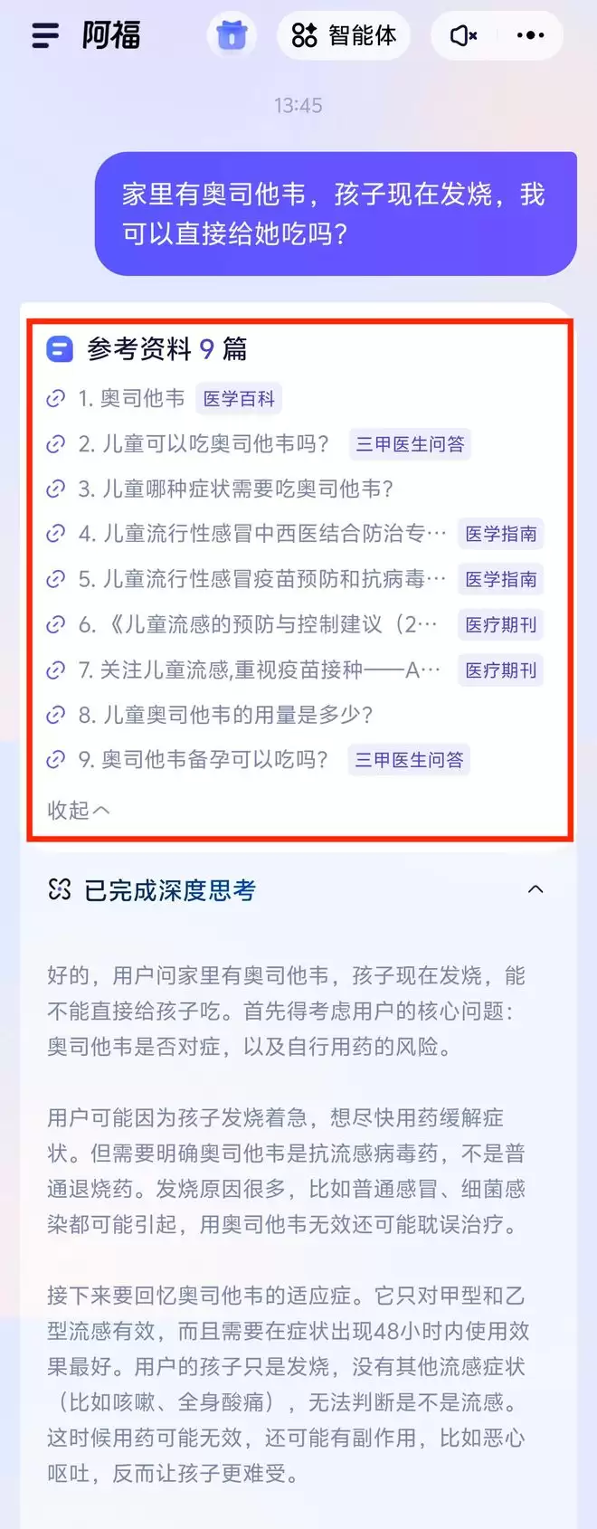 「家里有奥司他韦,孩子现在发烧,我可以直接给她吃吗?」面对这一提问,阿福展现了极强的「循证医学」素养。它一口气直接引用了 9 篇权威资料,包括医学百科、三甲医院医生的问答和医学指南。