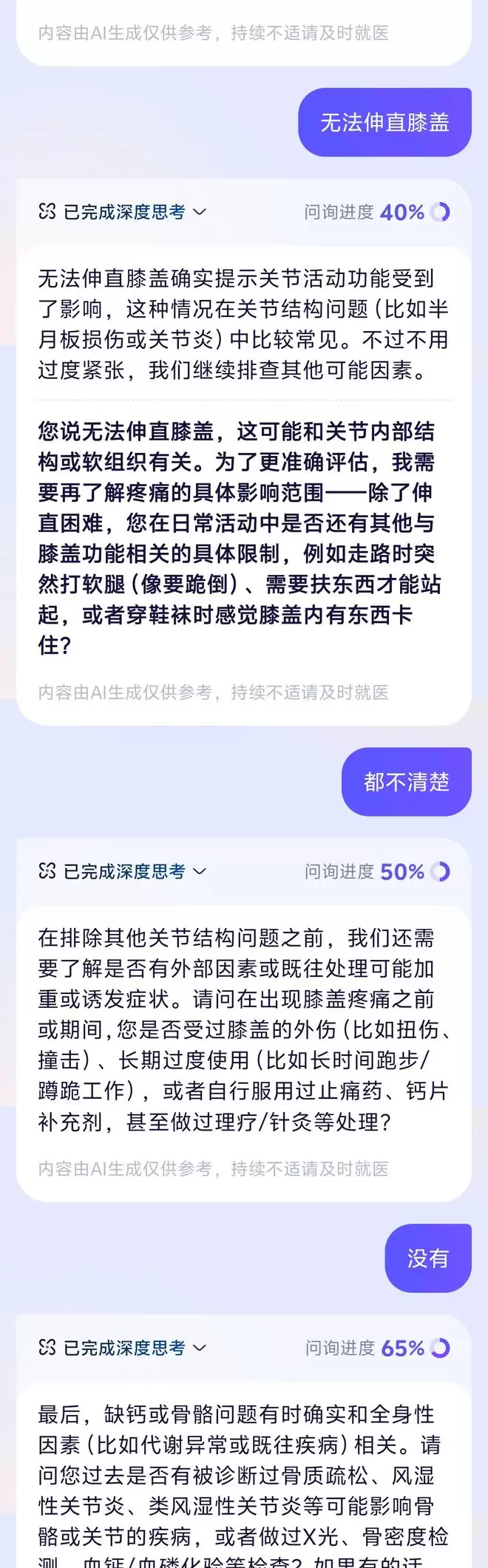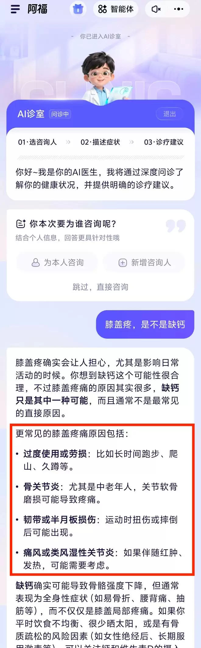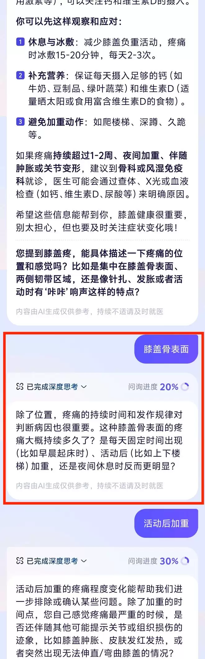 阿福真正厉害的地方,是在多轮对话中体现出来的。在 AI 问诊模式下,当我问这个问题,它先给出一个比较全面的建议。通用 AI 一般到这就结束了,但阿福会像真人医生一样多轮追问:疼痛具体在哪个位置? 上下楼梯时会不会加重? 有什么诱发症状吗? 有没有受过伤? 做过相关检查吗?