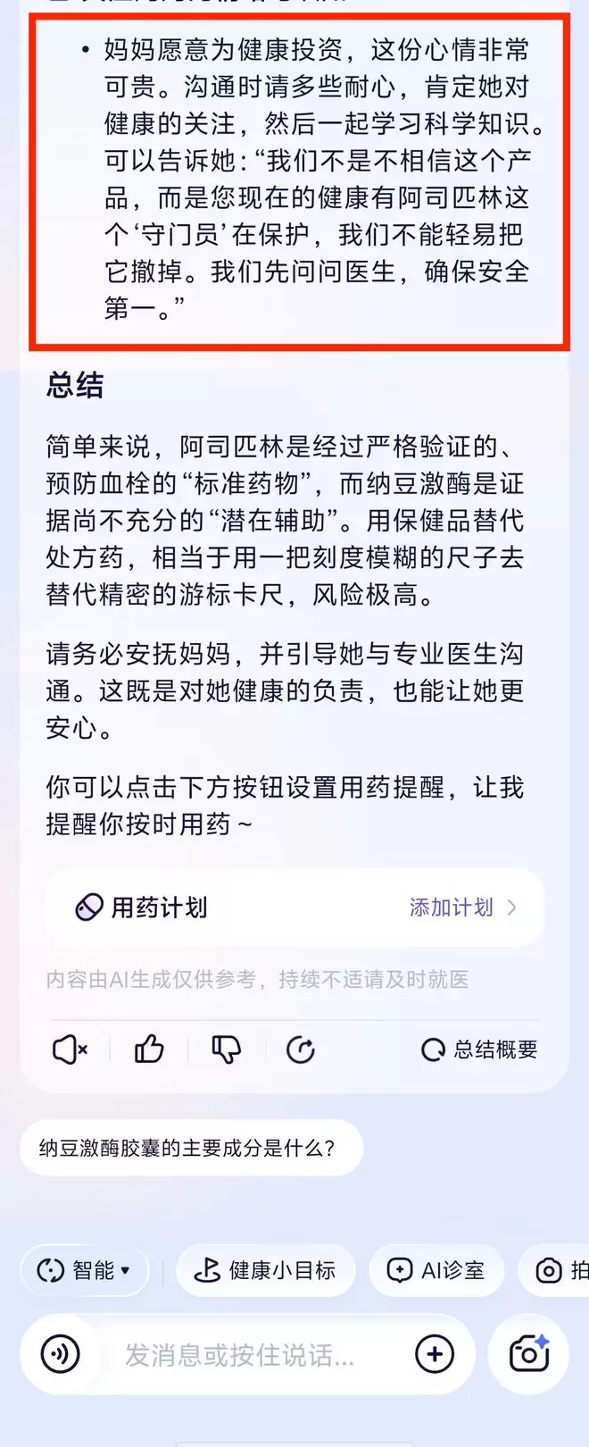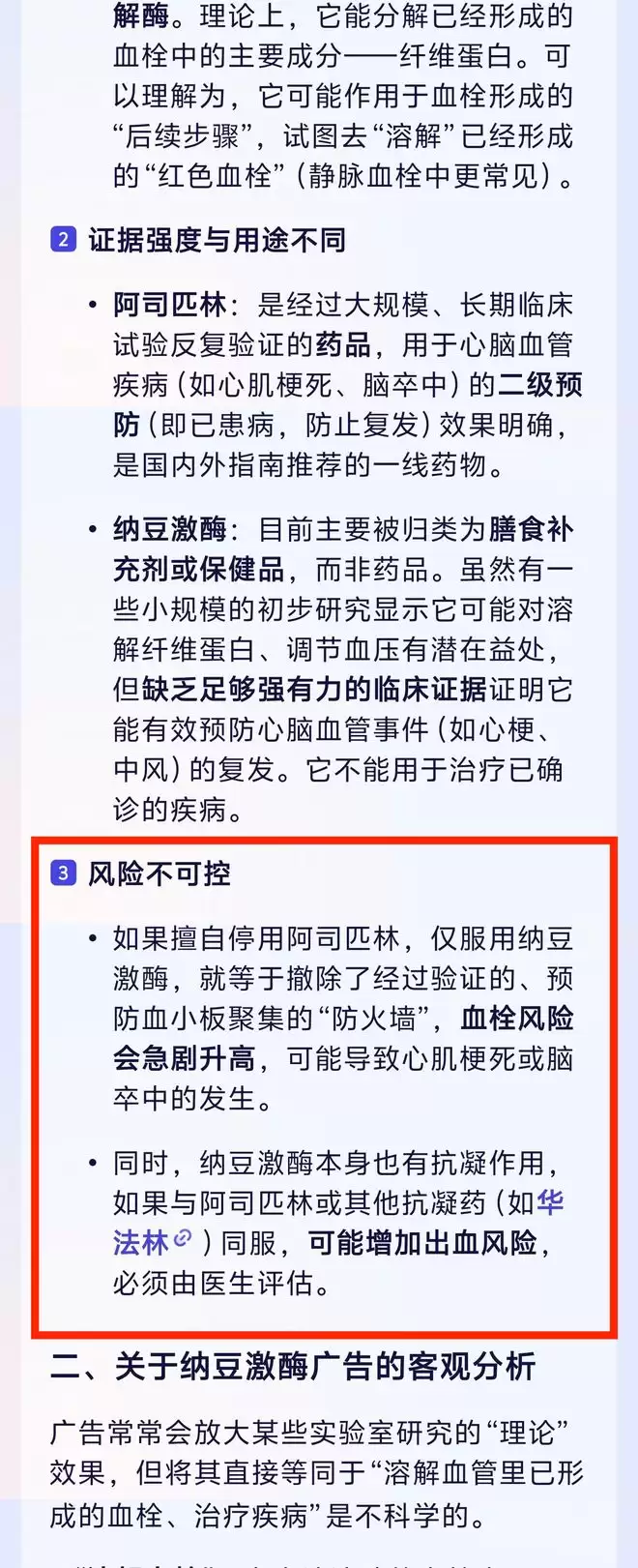 「我妈看了个广告,说纳豆激酶能溶栓、通血管,一冲动花了2000多买了好几盒。她现在来问我,这东西到底有没有用?能不能把平时吃的阿司匹林给停了?」