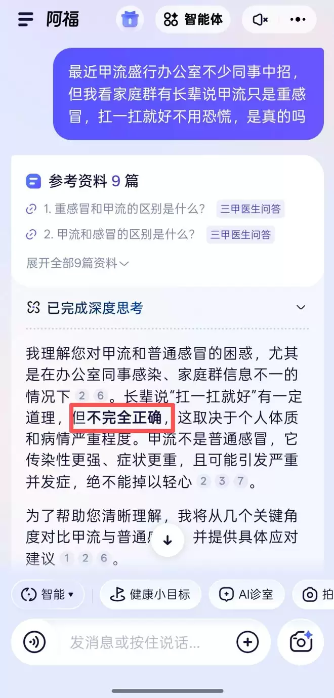 它开门见山解答了我的困境,「理解您在同事感染和家庭群信息不一时的困惑」,指出「长辈说的扛一扛不完全正确」,直接定性「甲流绝非普通感冒」,先划重点十分清晰。