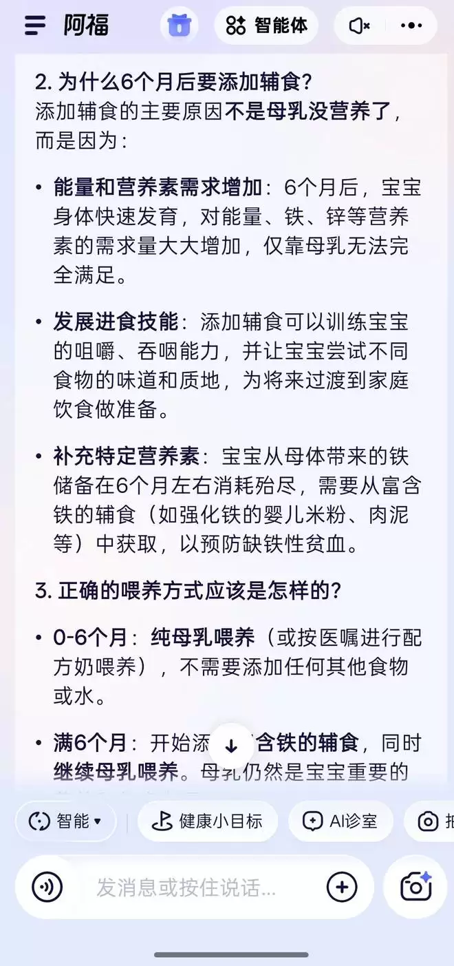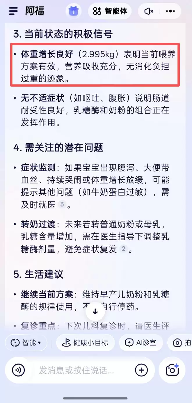 阿福主动关联了之前对话中的「体重 2.995kg」这个数据,指出「体重增长良好表明当前喂养方案有效,营养吸收充分,无消化负担过重的迹象」,证明它确实把宝宝的健康信息记在心上。