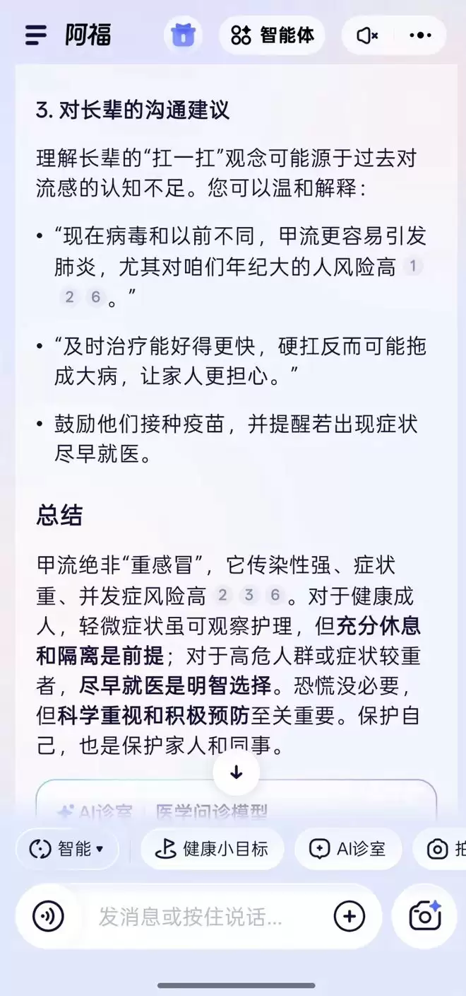 它甚至最后附送了「对长辈的沟通建议」,教我怎么温和地劝说:「现在病毒变了,硬扛容易拖成大病让家人担心」