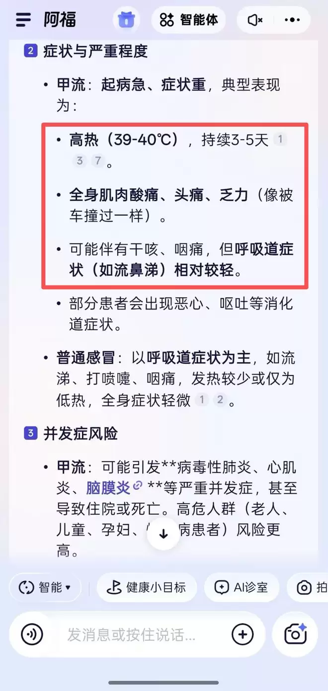 不过阿福回答有一点更讨喜,虽然阿福都引用了权威文献,但却翻译成了人话,从「像被车撞过一样的全身酸痛」这种形象比喻,到「持续高热3-5天」的具体指标,瞬间让人明白了严重性。
