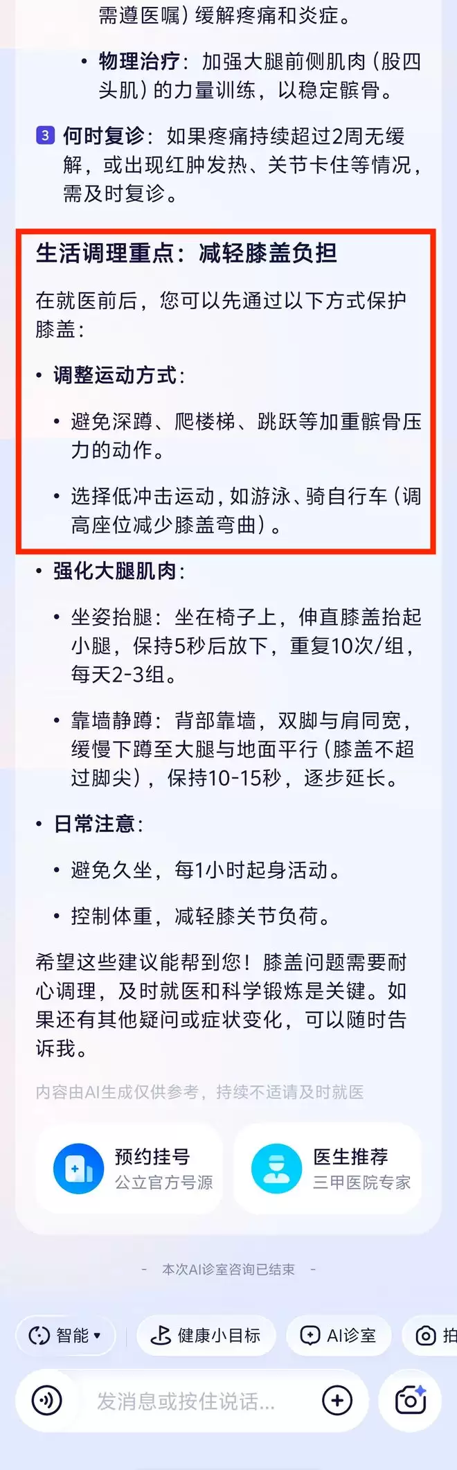 根据我的回答,它一步步找准问题,最后告诉我该挂什么科、怎么治疗、生活上要注意什么。术业有专攻,这种「追问-排查-确诊」的诊疗思维,确实与通用 AI 不在一个层次。