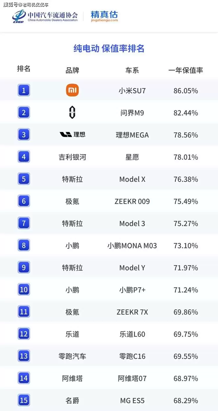 根据中国汽车流通协会发布的《2025年度中国汽车保值率报告》,在纯电动车型中,小米SU7以86.05%的一年保值率位居榜首,成为2025年度保值率最高的车型。紧随其后的是问界M9,一年保值率为82.44%,理想MEGA则以78.56%位列第三。吉利银河星愿、特斯拉Model X、极氪009等车型也跻身前十,显示出这些车型在市场上的高流通性和强产品力。