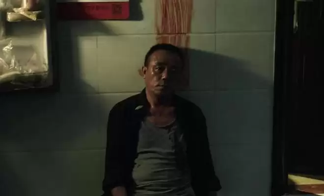 一个男人正在洗掉脸上的血迹,但在抬头的一瞬间,看到身后有人在挪动。