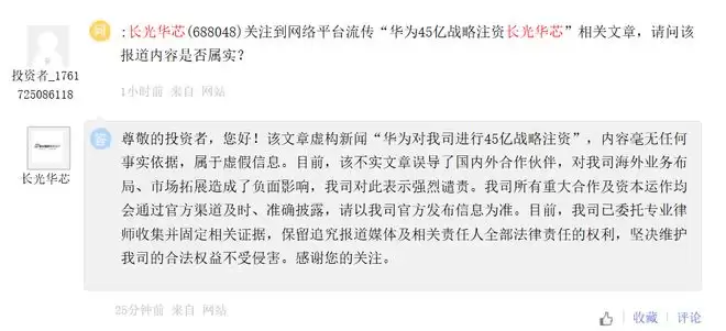 2月4日,有投资者在上证e互动平台向长光华芯提问,求证网络流传的“华为45亿战略注资长光华芯”这一消息是否属实。