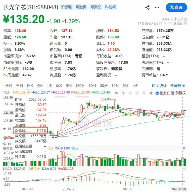 2月3日,长光华芯股价高开高走,当日收于137.1元/股,涨幅达7.02%。