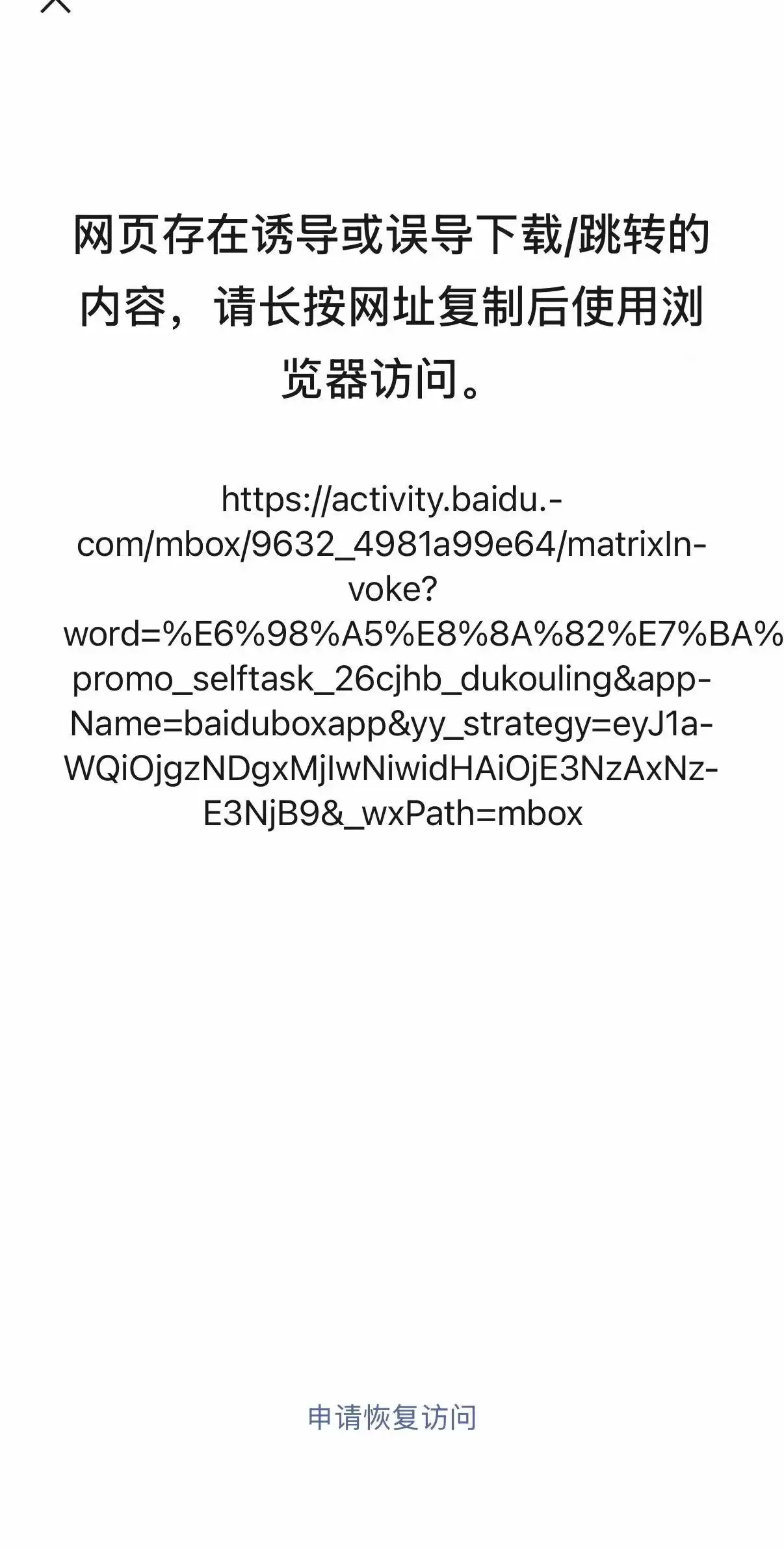2月4日晚些时候,继元宝红包分享链接之后,百度文心助手红包分享链接同样遭到微信屏蔽,页面提示该网页存在诱导或误导下载/跳转的内容,需要通过第三方浏览器访问。