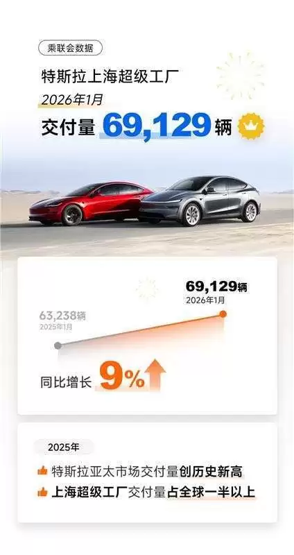 特斯拉上海工厂1月交付量涨9%,产量占全球过半