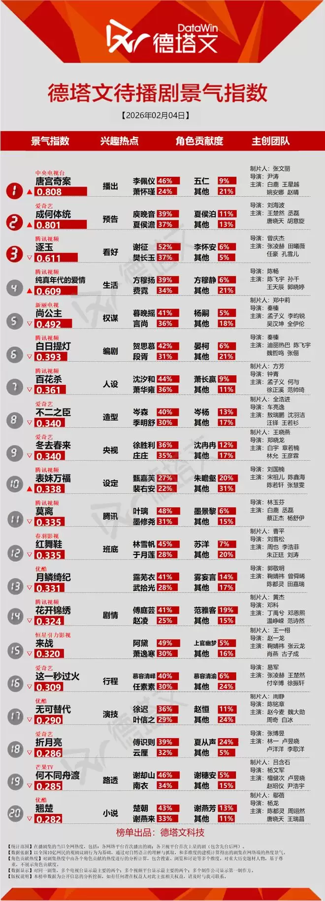 唐宫奇案(李佩仪46% 萧怀瑾24%) 成何体统(庾晚音39% 夏侯澹37%) 逐玉(谢征52% 樊长玉37%) 纯真年代的爱情 尚公主 白日提灯 百花杀 不二之臣 冬去春来 表妹万福 莫离 红舞鞋 月鳞绮纪 花开锦绣 来战 这一秒过火 无可替代 折月亮 何不同舟渡 翘楚