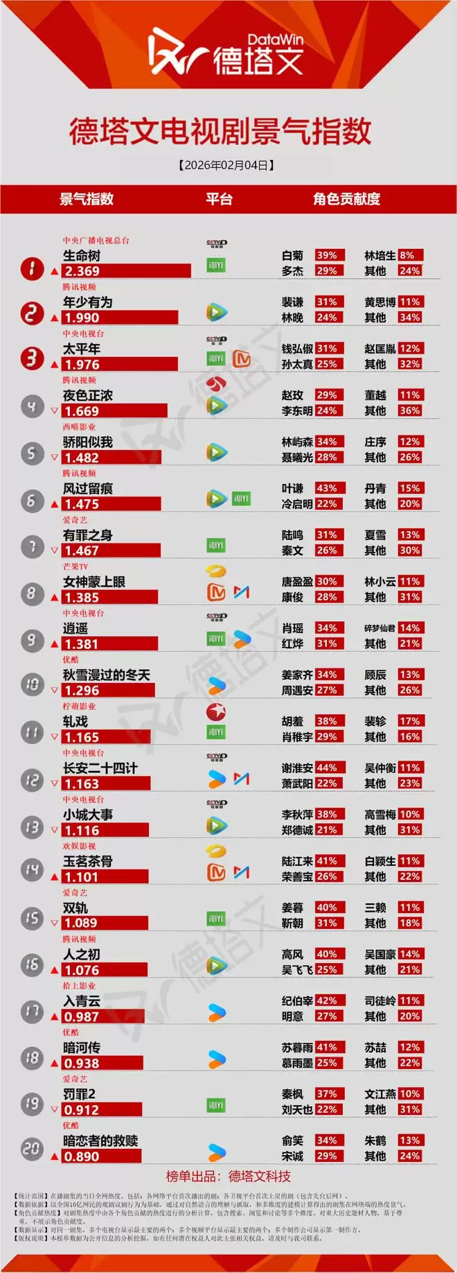 今日市场:《生命树》领跑榜单,《年少有为》《太平年》稳守榜单前列,头部剧集类型多元。