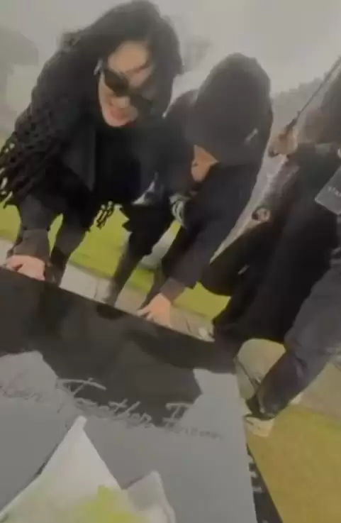 大家蹲下来,轻轻摸着大S的墓碑,小S还忍不住呼喊着:“珊,你真的是很爱闹场耶!一定要下雨才有她的风格。”