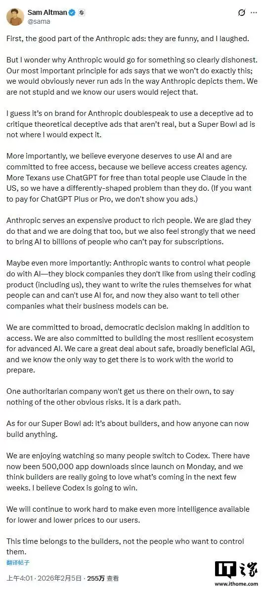 首先,Anthropic这则广告有可取之处:内容很有趣,我看了也笑了。但我实在不解,Anthropic为何要制作如此明显的不实广告。我们针对广告业务的核心原则明确禁止这类操作,我们绝不会以Anthropic所描绘的方式投放广告。我们并不愚蠢,也清楚用户绝不会接受这种做法。Anthropic惯用双面话术,用虚假广告去抨击根本不存在的、理论上的虚假宣传,这倒符合它的一贯作风,只是我没想到它会把这套用在超级碗广告上。更重要的是,我们认为人人都有权使用人工智能,并且始终坚持提供免费服务,因为我们相信,获取AI技术的权限能赋予人们自主能力。得克萨斯州免费使用ChatGPT的用户数量,已经超过了美国使用Claude的总用户数,因此我们面临的问题与Anthropic截然不同。(如果你选择付费订阅ChatGPT Plus或Pro版本,我们不会向你展示任何广告。)Anthropic的产品定价高昂,仅服务高消费人群。我们乐见他们这么做,自身也在布局高端市场,但我们同样坚定地认为,必须让数十亿无法承担订阅费用的普通民众也能用上人工智能。或许更关键的一点是:Anthropic妄图管控用户对人工智能的使用——它封禁不合心意的企业使用其编程产品(OpenAI也在封禁名单中),妄图自行制定人工智能的使用规则,如今还想插手其他公司的商业模式。我们不仅致力于让人工智能触达大众,更坚持推行民主化决策。同时,我们也在全力打造最具韧性的先进人工智能生态系统。我们高度重视构建安全、普惠的通用人工智能,也深知唯有与全球各方携手筹备,才能实现这一目标。单靠一家奉行威权主义的企业,根本无法达成这一目标,更不必说此举还存在其他显而易见的风险,这是一条黑暗的道路。至于我们的超级碗广告:核心是聚焦创作者,展现如今人人皆可创作开发的理念。看到越来越多的用户转向使用Codex,我们倍感欣喜。该产品自周一上线以来,应用下载量已突破50万次,我们相信开发者们一定会爱上未来几周推出的全新功能。我坚信,Codex终将赢得市场。我们会持续深耕,以越来越亲民的价格,为用户提供更强大的智能服务。这个时代属于创作者,而非妄图管控他们的人。
