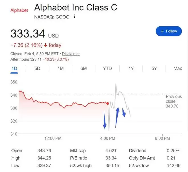 财报发布后,Alphabet股价盘后先跳水,盘后曾跌7.5%,市值瞬间蒸发约3500亿美元,后反弹转涨,盘后一度转涨超4%,市值在数分钟内剧烈波动约8000亿美元,此后又转跌。股价巨震体现出投资者对公司AI战略的矛盾情绪。