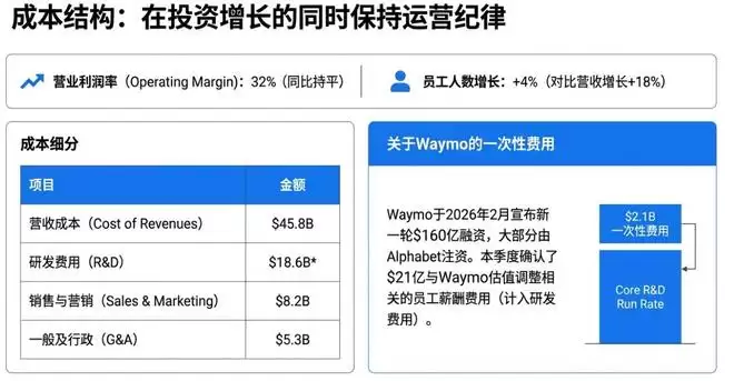 在研发投入激增且计入Waymo一次性薪酬费用的情况下,营业利润率仍能维持高位,反映出,搜索与云业务的利润贡献提升抵消了支出增加的压力。