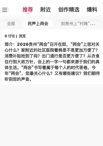 贵州省2026年两会将于1月26日,也就是下周一正式开幕。在日常生活中,您最关心和关注哪些议题呢?《百姓关注》APP特别上线了“民声上两会”专题,邀请您一同分享身边的大小事,说出您心底最真实的期盼。