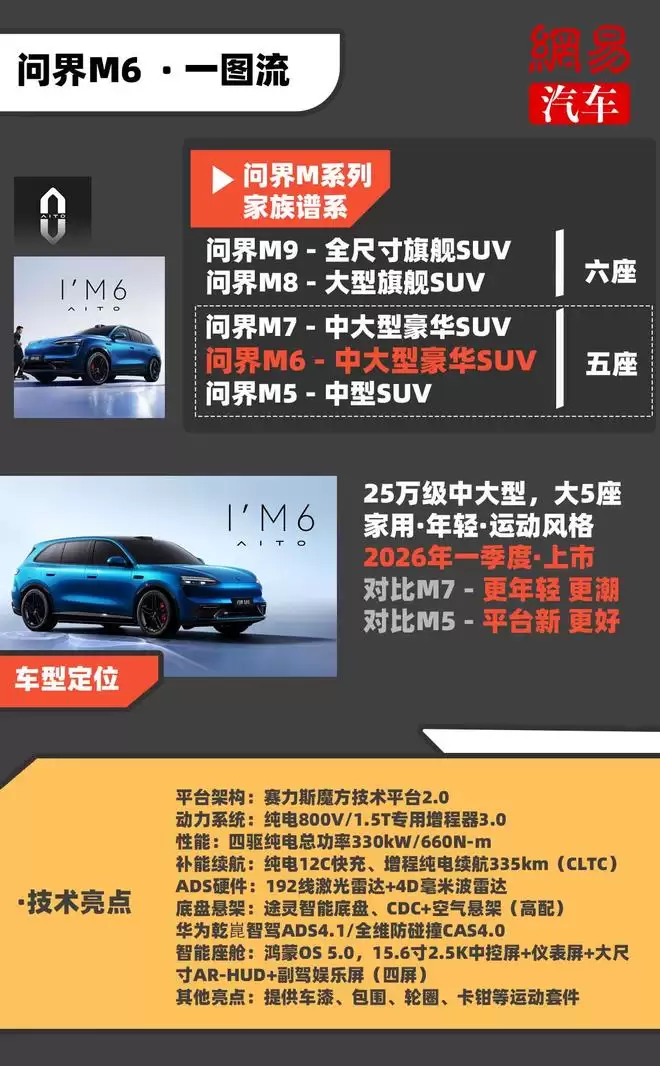 网易汽车2月3日报道,华为与赛力斯联合打造的问界品牌正式发布全新车型M6官图,标志着“56789”产品矩阵已完整落地。作为衔接问界M5(参数|图片)与M7之间的关键车型,M6以“年轻化运动美学”为核心设计语言,精准瞄准25-30万元级主流市场,目标直指BBA核心车型GLC/X3/Q5三大劲敌,同时也向理想L6正式宣战。