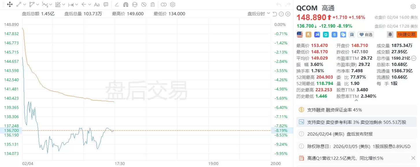 北京时间2月5日,高通股价出现显著回落,下跌超过8%,报收于136.7美元。该公司最新发布的第一财季业绩显示,经调整后的营收为122.5亿美元,与分析师的普遍预期122亿美元基本持平。