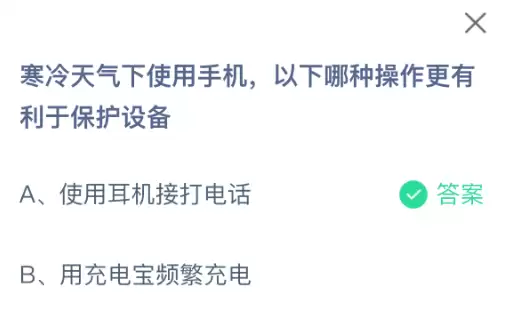 1、题目:寒冷天气下使用手机,以下哪种操作更有利于保护设备
