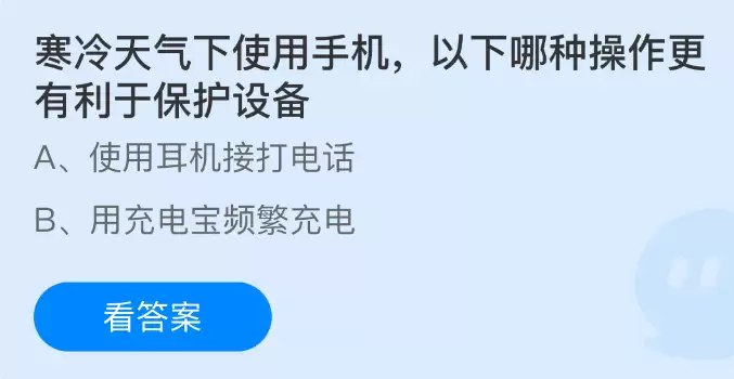 想在寒冷的天气里更好地保护你的手机设备吗?支付宝小鸡课堂开课啦!每天花一分钟参与答题赚取饲料,喂喂小鸡就能轻松贡献爱心,既有趣又有意义!2026年2月5日蚂蚁庄园的小鸡课堂题目正确答案是【使用耳机接打电话】。在寒冷天气下使用手机,用耳机接听电话能更好地保护你的设备。