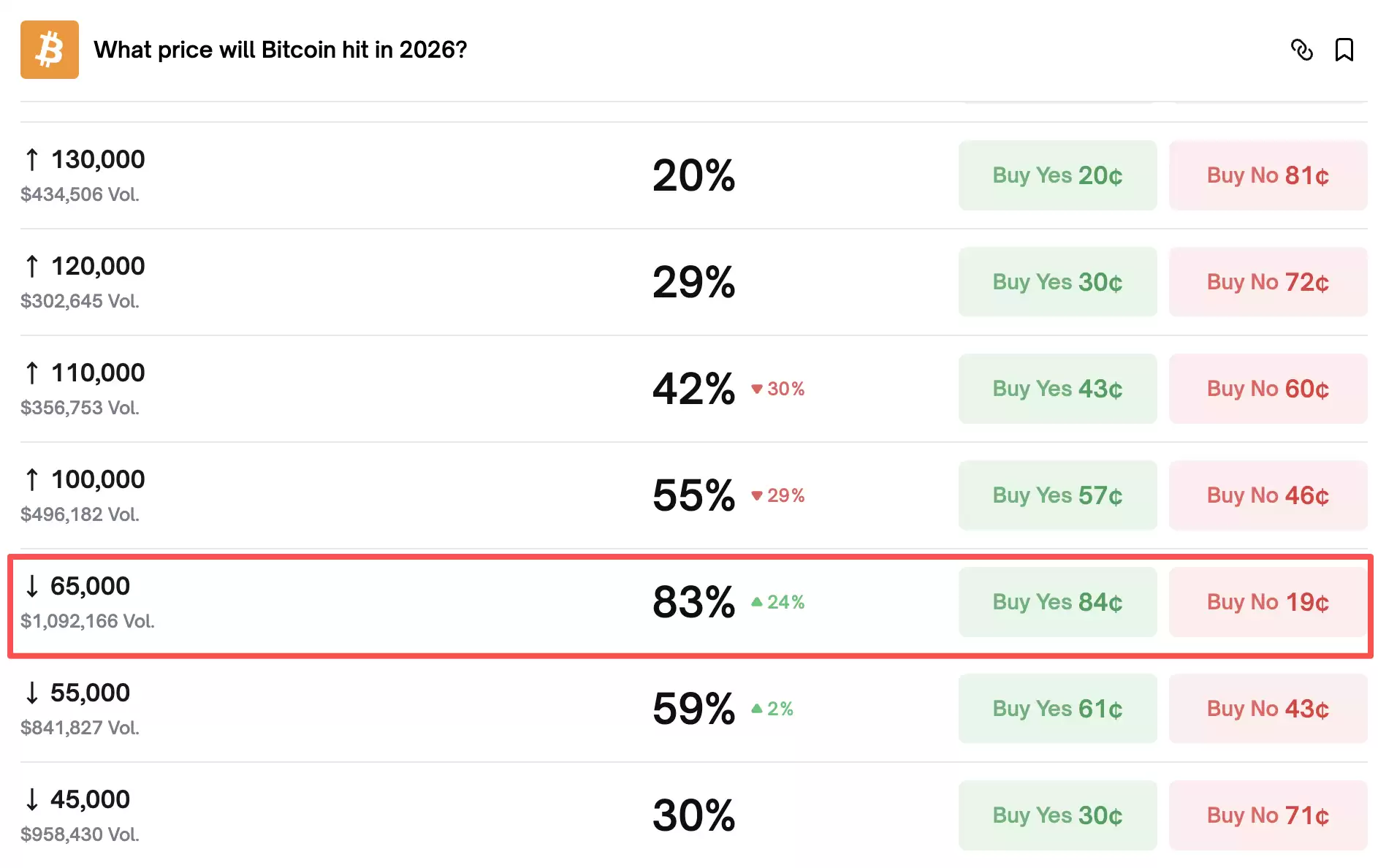 据Polymarket预测,比特币今年有83%的概率跌至65000美元,而跌至55000美元的概率已攀升至约59%。