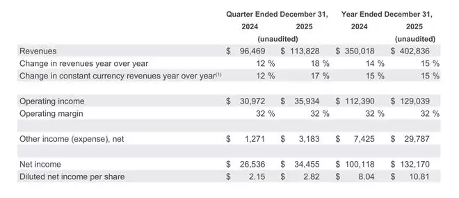 财报数据显示,Alphabet第四季度实现营收1138.3亿美元,同比增长18%;净利润达到344.6亿美元,同比大幅增长29.8%,均高于市场此前预期。纵观2025年全年,谷歌营收再创新高,达4028.4亿美元,同比增长15%;净利润则攀升至1321.7亿美元。