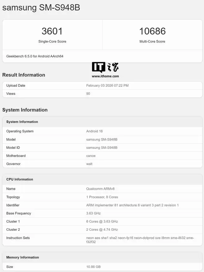 据科技媒体 Notebook Check 2月4日报道,三星 Galaxy S26 Ultra 手机日前亮相 GeekBench 性能测试平台。在 6.5.0 版本基准测试中,其单核成绩为 3601 分,多核成绩则达到 10686 分。