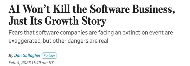另一篇来自WSJ报道,是这么说的:AI杀不死软件行业,只会终结它的增长神话。