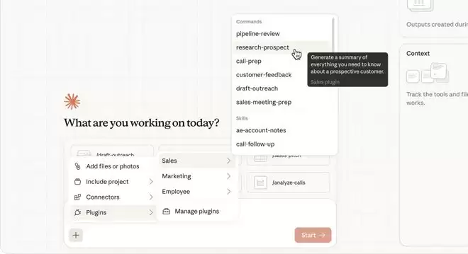 以「销售插件」为例:它可以将Claude接入个人CRM和知识库,学习销售流程。