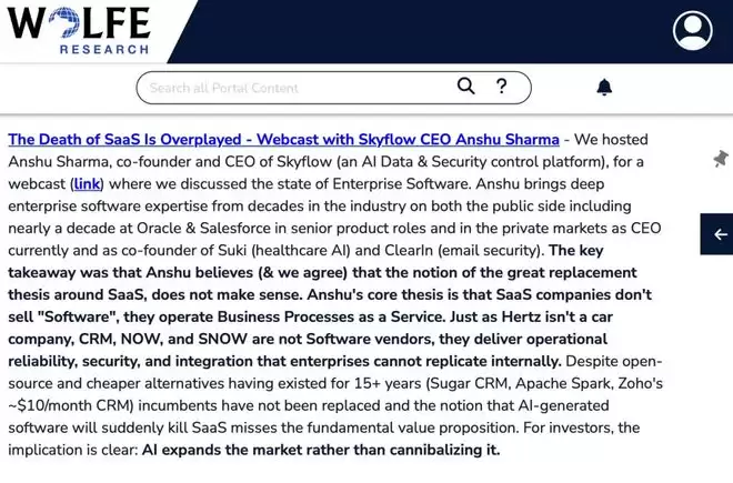 Wolfe Research(沃尔夫研究) 最新报告直言,「SaaS之死被夸大了」。