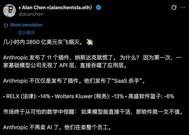 起因竟是,Anthropic为Claude Cowork植入「插件」(plugins)功能。仅凭一己之力,凌迟老牌巨头公司。