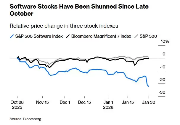 统计显示,过去一个月,标普北美软件指数下跌了18%,跌至2025年4月以来最低水平。