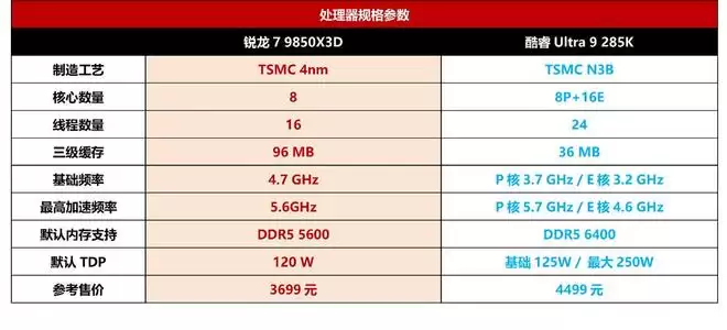 反观酷睿Ultra 9 285K,该处理器的规格也不算低,但其主打的是全能,就游戏应用而言,只能靠8个大核,多达16个小核只能是白白浪费电。在锐龙7 9850X3D频率提升之后,酷睿Ultra 9 285K性能核的最高频率只领先0.1GHz,几乎没什么优势,36MB的三级缓存容量也远低于对手。另外,酷睿Ultra 9 285K的最大TDP为250W,表现优于前一代酷睿i9-14900K,但远高于锐龙7 9850X3D。