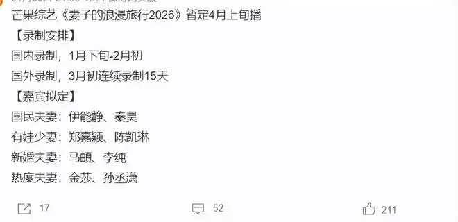 提到芒果的综艺节目,大家会想到哪档呢?近日,网上传出消息,《妻子的浪漫旅行2026》即将开始录制,这档综艺属于自带热度和关注度,根据知情人士透露,四对夫妻已经确定,竟全自带“热度”,各位读者,你们期