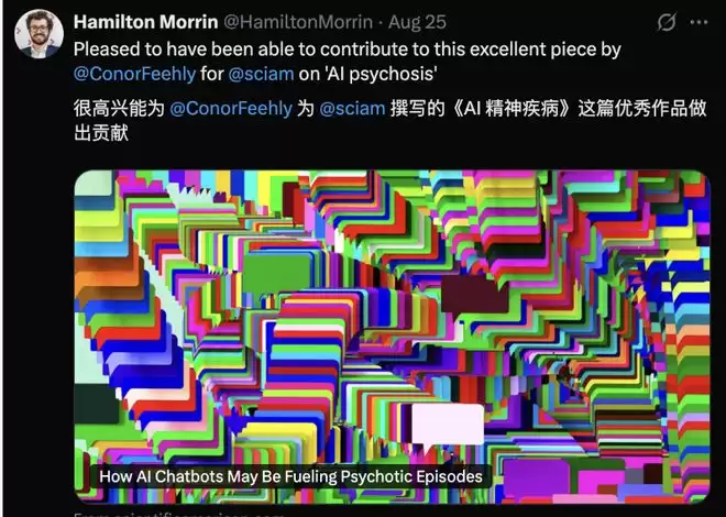 这个数字曾令伦敦国王学院精神病学家兼博士研究员Hamilton Morrin震惊,他在去年曾与人合著了一篇关于AI相关妄想的论文。