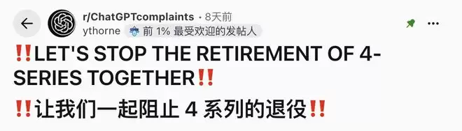网友们在Reddit上发起了一个请愿式帖子,呼吁停止退役GPT‑4o系列模型。