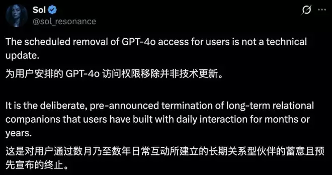 网友Sol表示,下线GPT-4o并非一次技术更新,而是「对用户通过数月乃至数年日常互动所建立的长期关系型伙伴的蓄意且预先宣布的终止。」