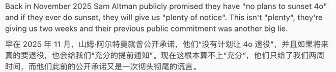两周的缓冲期等同于「突然中断」,无视了用户围绕这些特定模型行为所构建的工作流程。