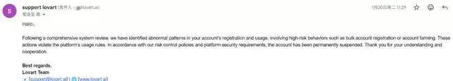 给大家翻译一下: 经过全面的系统审查,我们在您的账户注册和使用过程中发现了异常模式,其中涉及批量注册账户或“养号”(Account Farming)等高风险行为。这些行为违反了平台的使用规则。