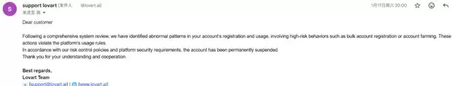 可以明确的是,这个账号只在一台机器上使用,只在最新网页登录使用。 用量肯定不小, 同时开了chrome和edge浏览器去使用。 但"无限"的广告词是Lovart正式提的, 以"farming"和"刷机"封号这是什么情况?