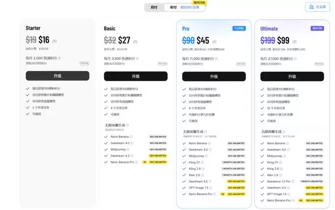 PRO年费会员可以无限使用香蕉模型 在之上还有一个unlimited的年费会员,基本上可以使用所有视频模型.